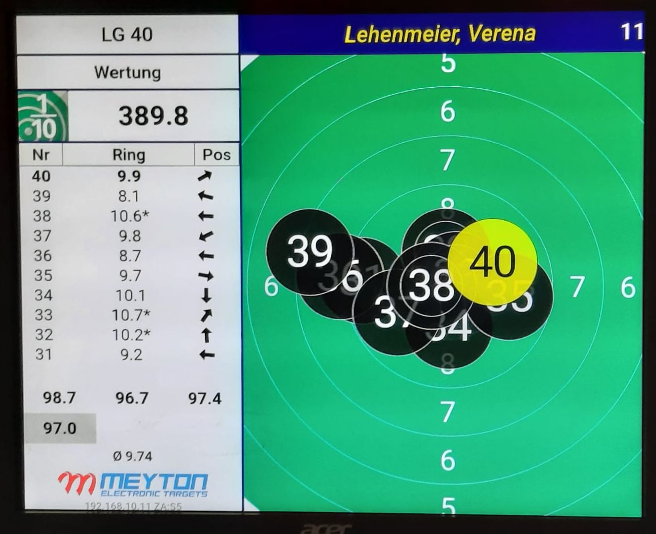 | Verena Lehenmeier | 98,7 | 96,7 | 97,4 | 97,0 | 389,8 | 1. Platz |